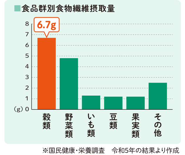 実は日本人の食物繊維摂取源の第一位は「穀類」つまり、主食として食べるごはんやパン、麺類などです。食物繊維は野菜から、というイメージが強いかもしれませんが、1日3回、一定の量を食べる主食は重要な食物繊維摂取源となっています。主食を抜くとその分、一日でとれる食物繊維は減ってしまいます。