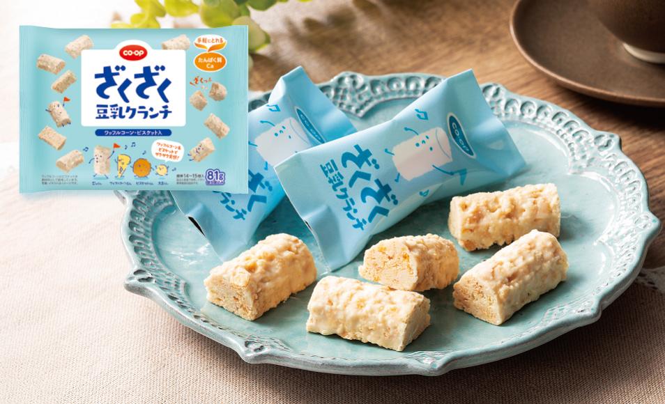 ワッフルコーンとビスケットを入れてざくざく食感に仕上げた、一口サイズのクランチです。まろやかな甘さの豆乳風味。
