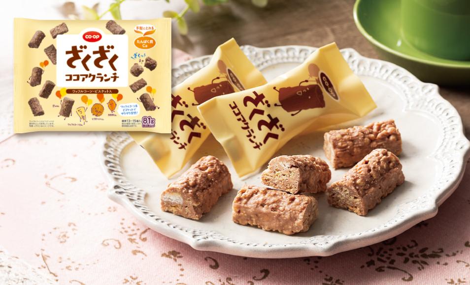 世界的なカカオの不作・高騰の中、組合員さんが利用しやすい価格でおいしいお菓子が作れないか?と考えて開発しました。カカオを使わず、豆乳パウダーやココアパウダー、ワッフルコーン、ビスケットなどを組み合わせて味わいを調整。