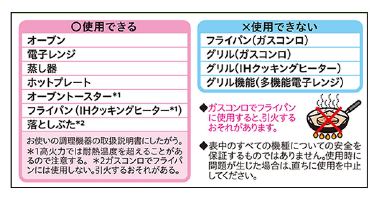 • 使用できる調理器具一覧をパッケージに追加し、オーブンだけでなく電子レンジや蒸し器でも使えることが分かりやすくなりました。