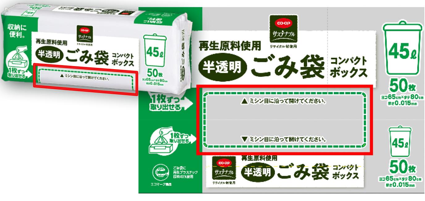 「開け口が分かりにくい」という組合員の声を受け、開け口のミシン目部分に色を付けて、すぐにあけ口がわかるように改良しました。
