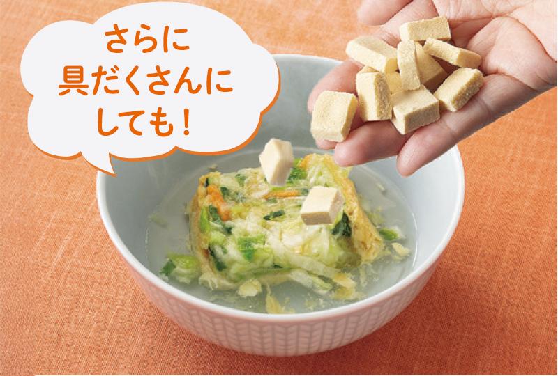 お湯を入れたスープに ミニこうや豆腐を追加して、 レンジで1分加熱